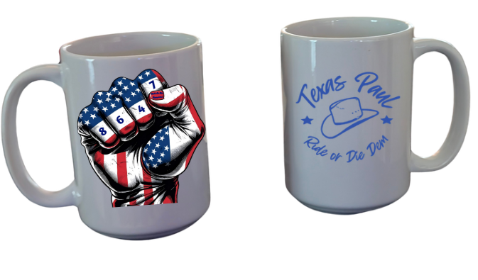 8 6 4 7 simple, yet strong message on this 15 oz ceramic mug. Double sided with message on one side and the Texas Paul iconic logo on the other. Handwash